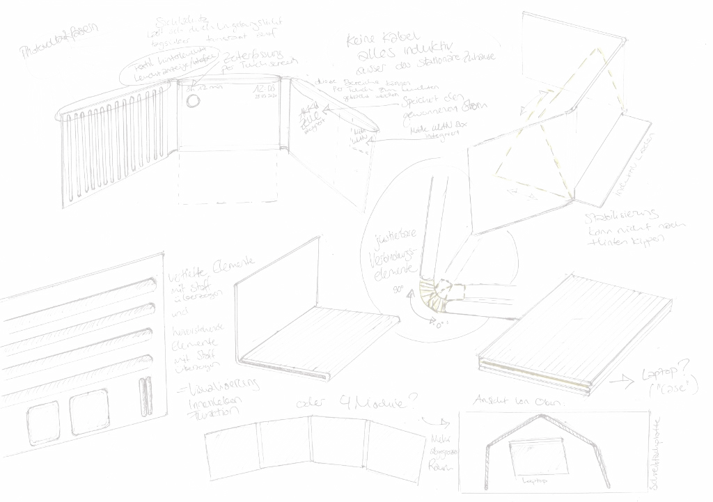 Die Umfrage unter 130 Berufstätigen zeigte klar: Lärm, fehlender Sichtschutz und unzureichende Infrastruktur sind die grössten Hindernisse beim mobilen Arbeiten. Bestehende Lösungen sind entweder zu sperrig oder bieten keinen vollwertigen Arbeitsplatz. Es fehlte ein Konzept, das Mobilität, Ergonomie und Autarkie in einem kompakten Produkt vereint.